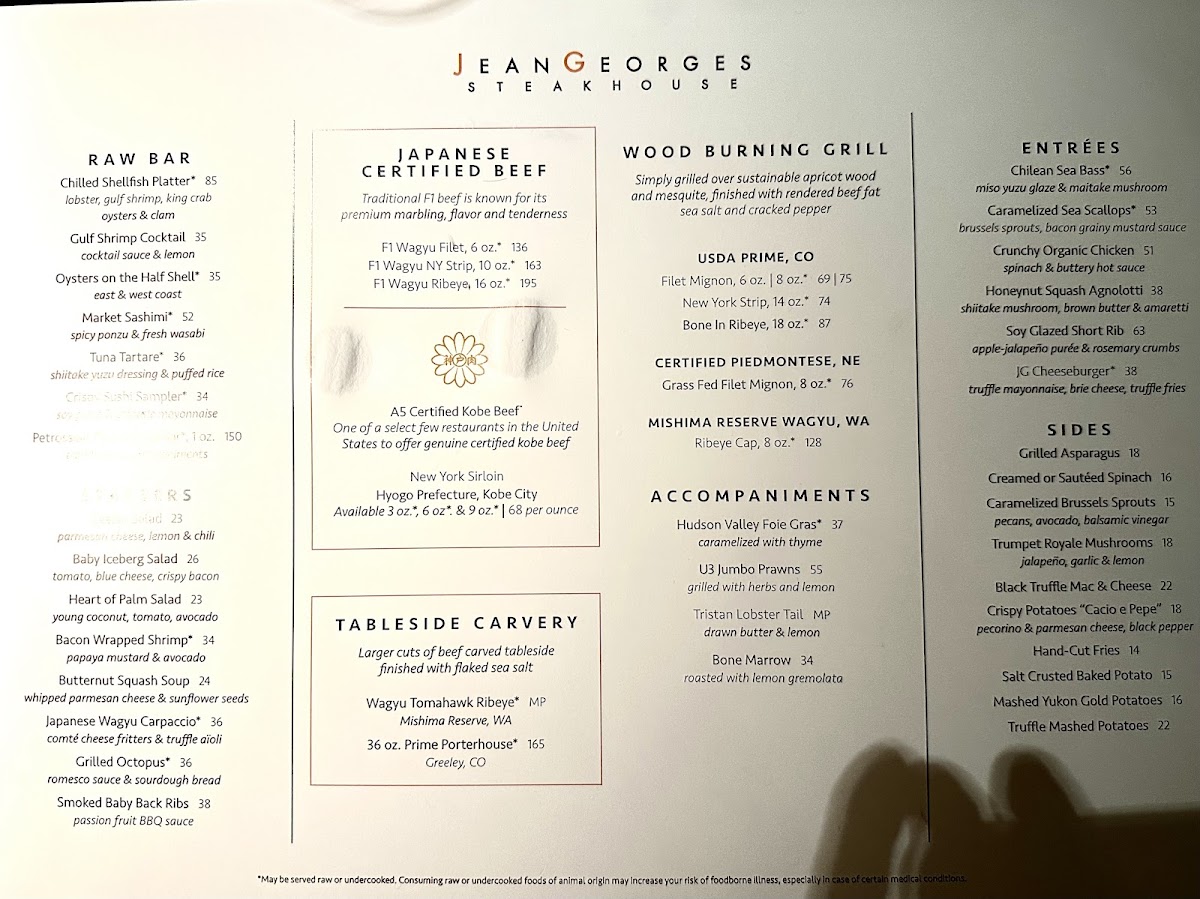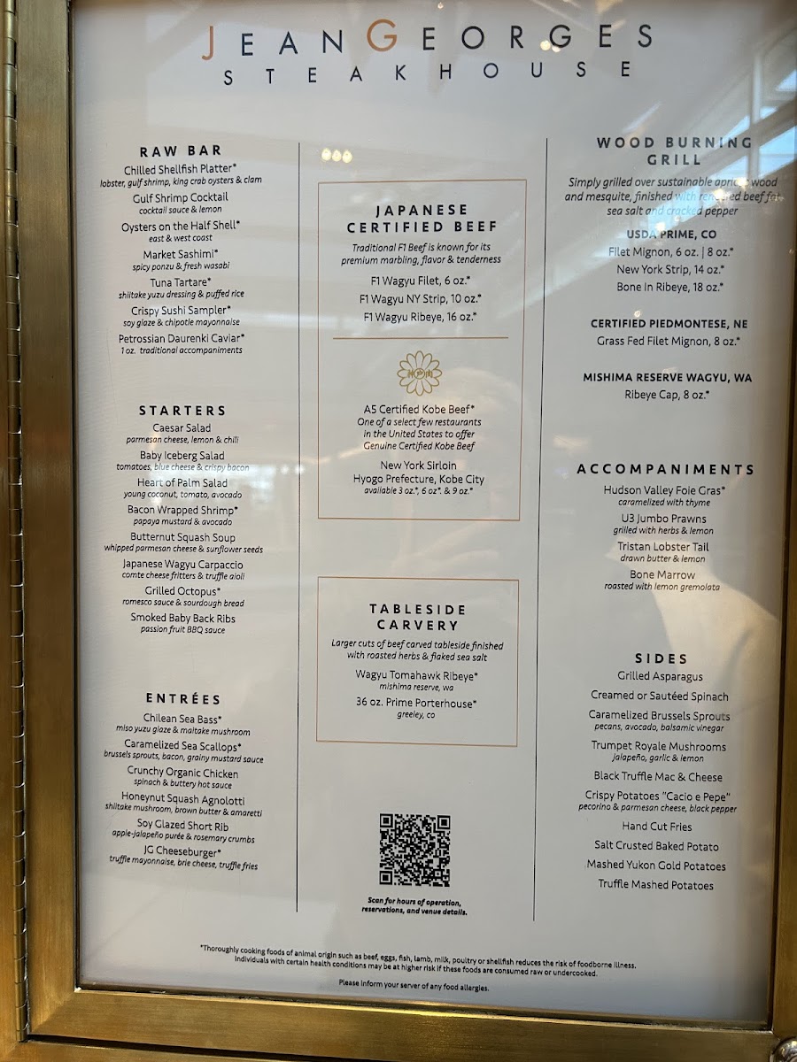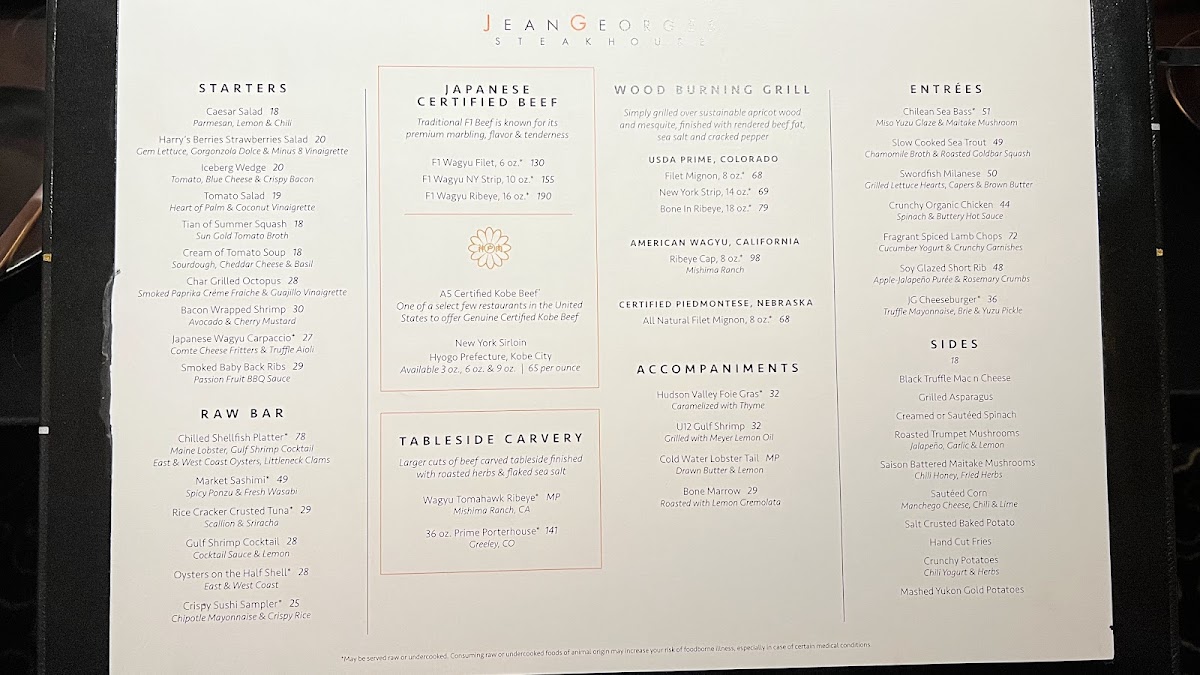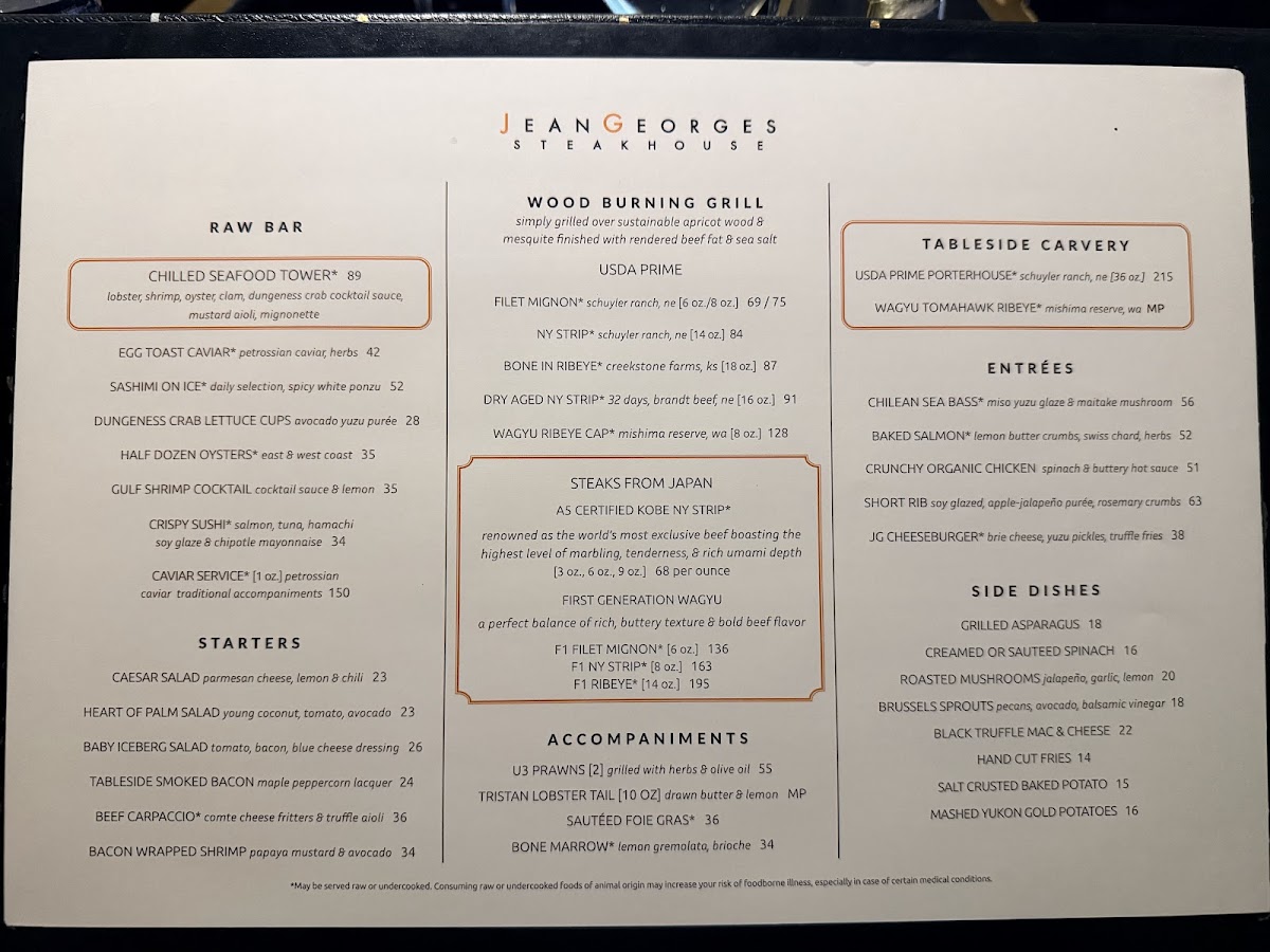 The menu at Jean Georges Steakhouse offers a refined yet approachable selection that aligns perfectly with its elegant and inviting atmosphere. Here, you’ll find thoughtfully crafted dishes that highlight premium quality ingredients, from rich, savory steaks to thoughtfully curated seafood and seasonal sides.